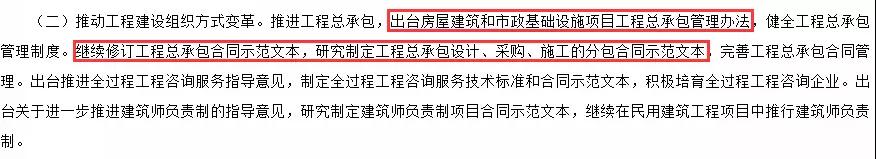 《2018年工作要點》指出:推進工程總承包,出臺房屋建筑和市政基礎(chǔ)設(shè)施項目工程總承包管理辦法。
